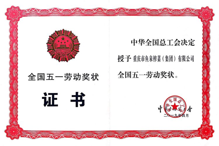 4月23日,全国总工会在人民大会堂举行2019庆祝“五一”国际劳动节暨全国五一劳动奖和全国工人先锋号表彰大会”。重庆市鱼泉榨菜(集团)有限公司荣获“全国五一劳动奖状”